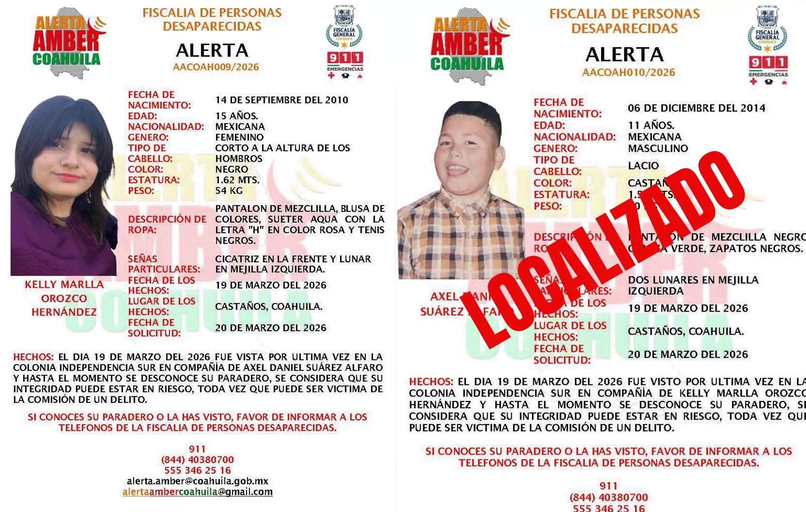 Tras la activación de la Alerta Amber el pasado 20 de marzo, el menor Axel Daniel Suárez Alfaro, de 11 años de edad y originario del municipio de Castaños, fue localizado este domingo 22 de marzo en el municipio de Monterrey, Nuevo León.