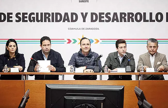 Saltillo, Coah.- El gobernador Manolo Jiménez Salinas presidió la reunión del Consejo de Seguridad y Desarrollo Regional Sureste, en la que se presentaron avances del fortalecimiento de la economía y del empleo 2025-2026, así como los indicadores en seguridad y los avances en las obras de infraestructura sostenible.