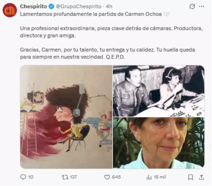“Lamentamos profundamente la partida de Carmen Ochoa. Una profesional extraordinaria, pieza clave detrás de cámaras. Productora, directora y gran amiga. Gracias, Carmen, por tu talento, tu entrega y tu calidez”, indicaron.
