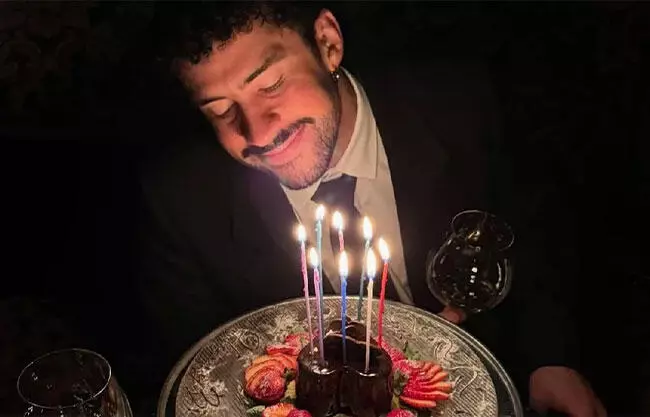 En la imagen se ve al cantante sentado frente a un pequeño pastel con varias velas encendidas, acompañado de fresas y una copa de vino. La escena, con iluminación tenue, muestra al artista mirando las velas mientras sonríe ligeramente.