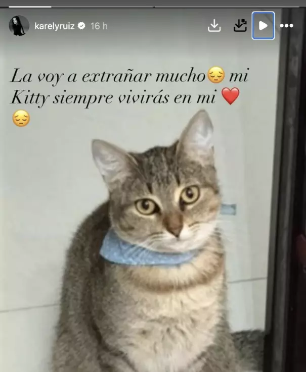 A través de sus redes sociales, la creadora de contenido Karely Ruiz compartió una imagen despidiendo a su gatita de nombre Kitty. La influencer expresó que la extrañará mucho y a pesar de su muerte, siempre la recordará y vivirá en ella. En la foto aparece el felino con una tierna vista mirando a la cámara.