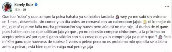 En la parte final del texto, Karely Ruiz aseguró que no necesita comprar cinturones y la próxima vez no aceptará peleas para que no especulen que las arregló. Finalmente reconoció la valentía de Kim Shantal por subirse dos veces a pelear, aunque los dos combates los haya perdido.
