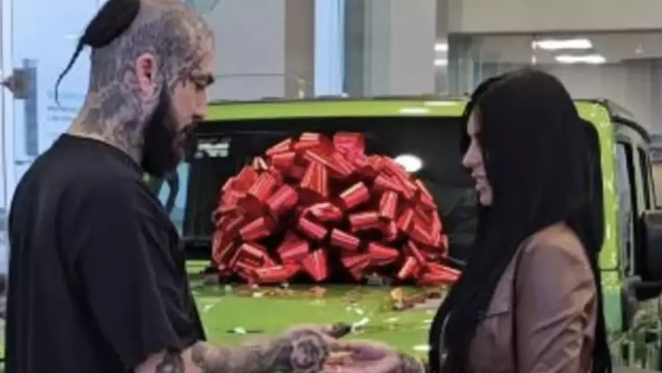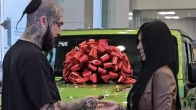 El clip muestra a Dharius entregando las llaves de una camioneta verde, modelo Jeep Rubicon, a quien fue su amor, la influencer Samantha Sadat.