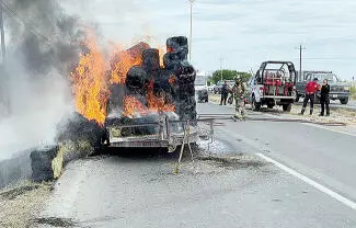 Frontera, Coah.- Un incendio registrado sobre la carretera federal número 30, en el tramo con dirección de poniente a oriente, dejó como saldo la pérdida total de un cargamento de aproximadamente 150 pacas de alfalfa que eran transportadas en una traila, sin que se reportaran personas lesionadas.