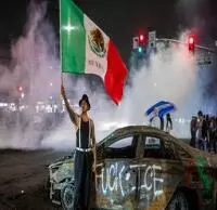 Detrás, un coche quemado, una humareda y una pinta que reza: "Fuck ICE"; al frente, un hombre joven tatuado y una bandera de México más grande que él, ondeando a lo largo y ancho y en el plano subliminal de todo ello hay un mensaje: el caos tiene una firma y no es estadunidense.
