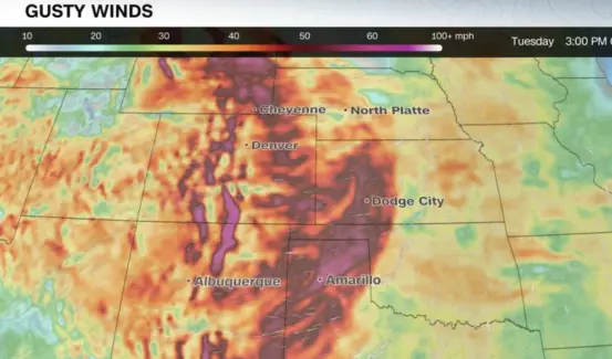 Las ráfagas de viento ya están aumentando en la región y solo incrementarán durante la tarde. Burlington, Colorado, registró una ráfaga de 114 km/h y se han observado ráfagas de más de 96 km/h en el oeste de Kansas y el Panhandle de Oklahoma y Texas.