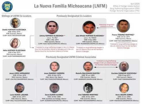 Otros integrantes de LNFM sancionados y designados como terroristas por parte del gobierno de Trump son Ubaldo Hurtado Olascoaga, encargado de sicarios, de extorsiones y de la extracción ilícita de mercurio y uranio para la organización criminal.