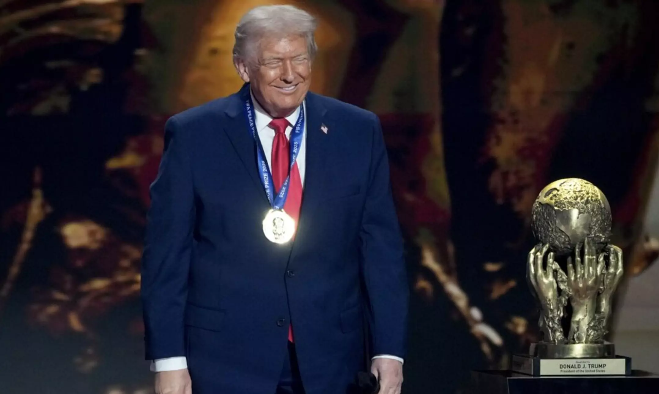 Trump llevaba una medalla alrededor de su cuello y estaba de pie cerca de un trofeo de oro en el escenario que representaba manos sosteniendo el mundo y llevaba su nombre.