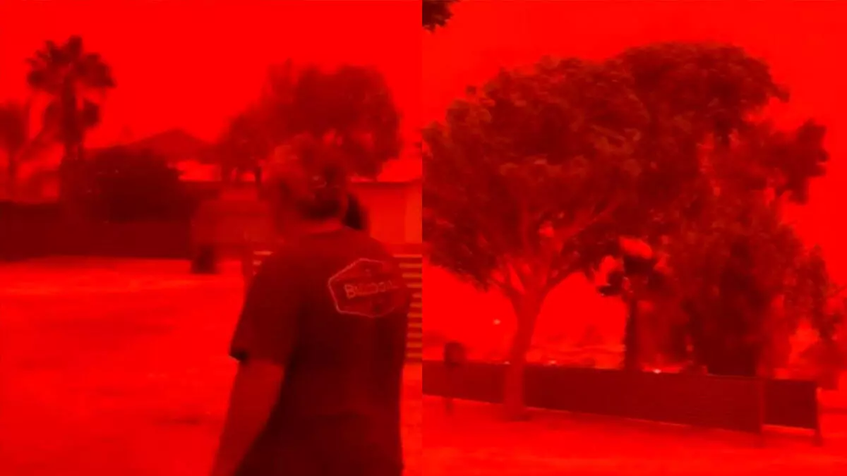 El cielo de parte de Australia se volvió rojo debido al paso del ciclón Narelle, que levantó polvo con elevado contenido de óxido de hierro desde suelos áridos. Estas partículas, sumadas a densas nubes y humedad, dispersaron la luz solar de forma tal que predominó el tono rojizo y el día se transformó por completo, borrando la visibilidad en minutos y dificultando la respiración.