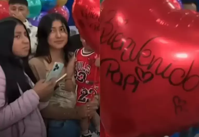 En medio de la zona de arribos, una mujer sostenía un globo en forma de corazón que decía: “Bienvenido, papi”. A su lado, un pequeño observaba con curiosidad el movimiento del aeropuerto mientras la joven esperaba con evidente nerviosismo.