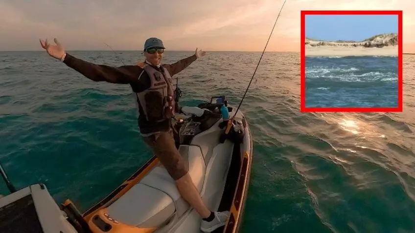 Con su poderosa mandíbula, el tiburón logró soltarse, solo para volver con más de una decena de sus amigos para rodear la moto acuática de Barley, quien en ningún momento perdió la calma.