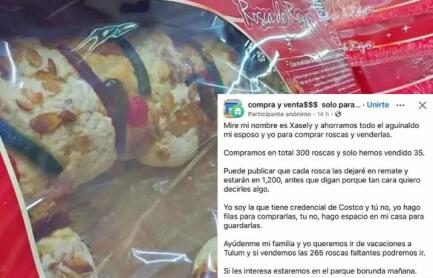 Ciudad de México.- En el marco del Día de Reyes, una revendedora de Costco desató controversia en redes sociales al pedir apoyo para vender 265 Roscas de Reyes que le sobraron tras adquirir 300 con la intención de revenderlas. La mujer, identificada como Xasely, buscaba financiar unas vacaciones familiares a Tulum con las ganancias.