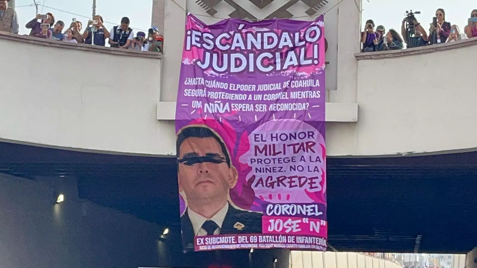 Saltillo, Coah.- En el puente a desnivel del cruce de los bulevares Francisco Coss y V. Carranza, el movimiento feminista colgó una lona para exhibir el caso de José “N”, un ex subcomandante del 69 Batallón de Infantería de Saltillo quien según la denuncia no reconoce a su hija.