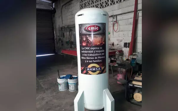 La alcancía, fabricada con un tanque de gas de 500 kilos y lista para su colocación, se instalará una vez que se obtenga el permiso correspondiente, trámite que tiene pendiente el ex obrero Ervey Valenzuela.