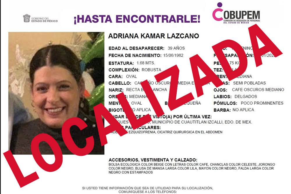 Monclova, Coah.- Adriana Kamar Lazcano fue localizada a 10 días de su desaparición, luego de salir de su domicilio en la ciudad de Monclova, Coahuila.
