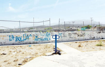 Las ‘obras de arte’ de los grafiteros son notorias a primera vista, ya que las paredes exteriores de la cancha están saturadas de firmas y nombres, además de palabras altisonantes, trazados con pintura en aerosol.