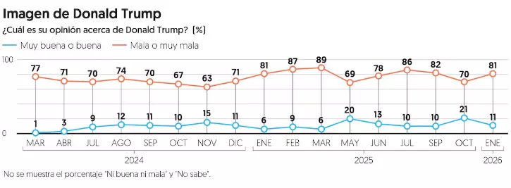 En este enero, el presidente de Estados Unidos, Donald Trump, nuevamente insistió en esa posibilidad, lo cual probablemente ha reforzado el rechazo entre la opinión pública mexicana. Según el sondeo, la imagen de Donald Trump se mantiene en una mayorÃa negativa, con 81 por ciento que opina mal o muy mal acerca de él, frente al 11 por ciento que expresa una opinión buena o muy buena.
