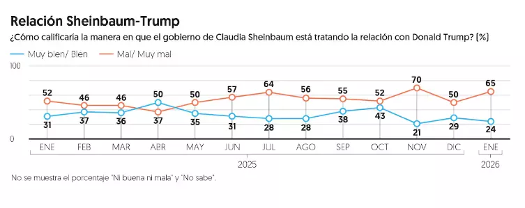 La encuesta nacional de El Financiero realizada en enero revela que una mayorÃa de 78 por ciento de mexicanos está en desacuerdo con el empleo de fuerzas militares de Estados Unidos para combatir a grupos criminales en México. El 21 por ciento dijo sà estar de acuerdo con esa posibilidad. Esas cifras son muy parecidas a las que se registraron en diciembre pasado, y en ambos casos el rechazo ha sido más alto desde enero de 2025.