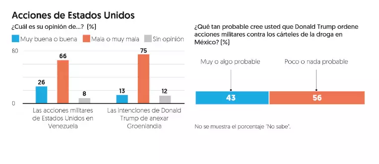 Por su parte, ante las intenciones de Trump de anexar Groenlandia a su paÃs, 13 por ciento expresó una opinión favorable y 75 por ciento una opinión desfavorable. Al plantear la pregunta de qué tan probable es que Donald Trump ordene acciones militares contra los cárteles de la droga en México, 43 por ciento piensa que es un escenario muy o algo probable, mientras que una mayorÃa de 56 por ciento cree que es poco o nada probable.