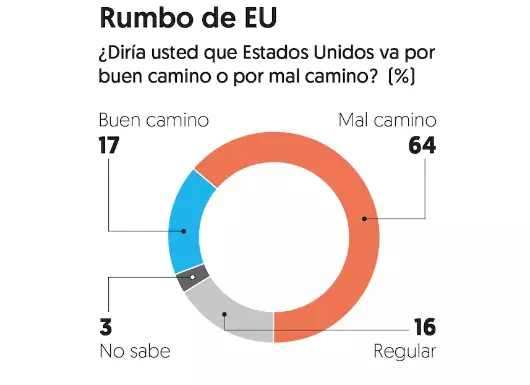 El sondeo revela que una mayorÃa de casi dos tercios de mexicanos, 64 por ciento, considera que Estados Unidos va por mal camino, mientras que 17 por ciento cree que va por buen camino.