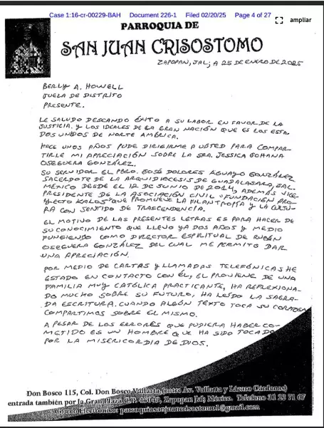 "Proviene de una familia muy católica practicante, ha reflexionado mucho sobre su futuro, ha leído la Sagrada Escritura. Cuando algún texto toca su corazón, compartimos sobre el mismo", escribió el sacerdote a la Jueza Beryl A. Howel.