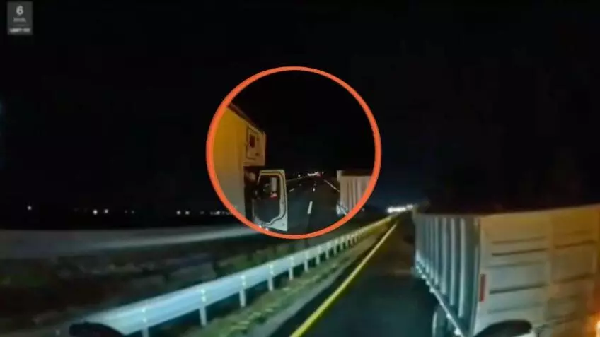 El video comenzó cuando el camionero observó que frente al camino estaba estacionada una camioneta también de carga, la cual ocupaba la mitad de uno de los carriles. Cuando el trailero frenó para rebasar el auto estacionado, de pronto llegó otro tráiler.