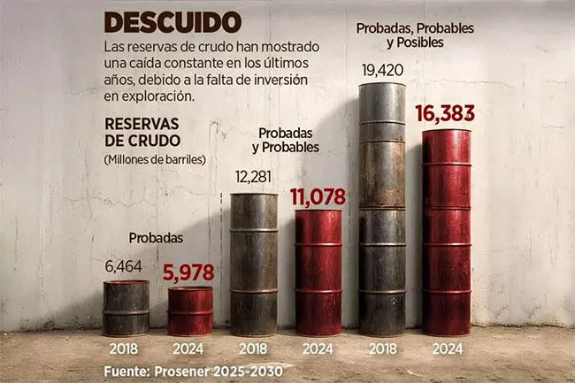 En ese mismo periodo, las Probadas y Probables (2P), así como las Probadas (1P) cayeron 10 y 8 por ciento respectivamente, expone el Programa Sectorial de Energía 2025-2030 de la Secretaría de Energía (Sener).