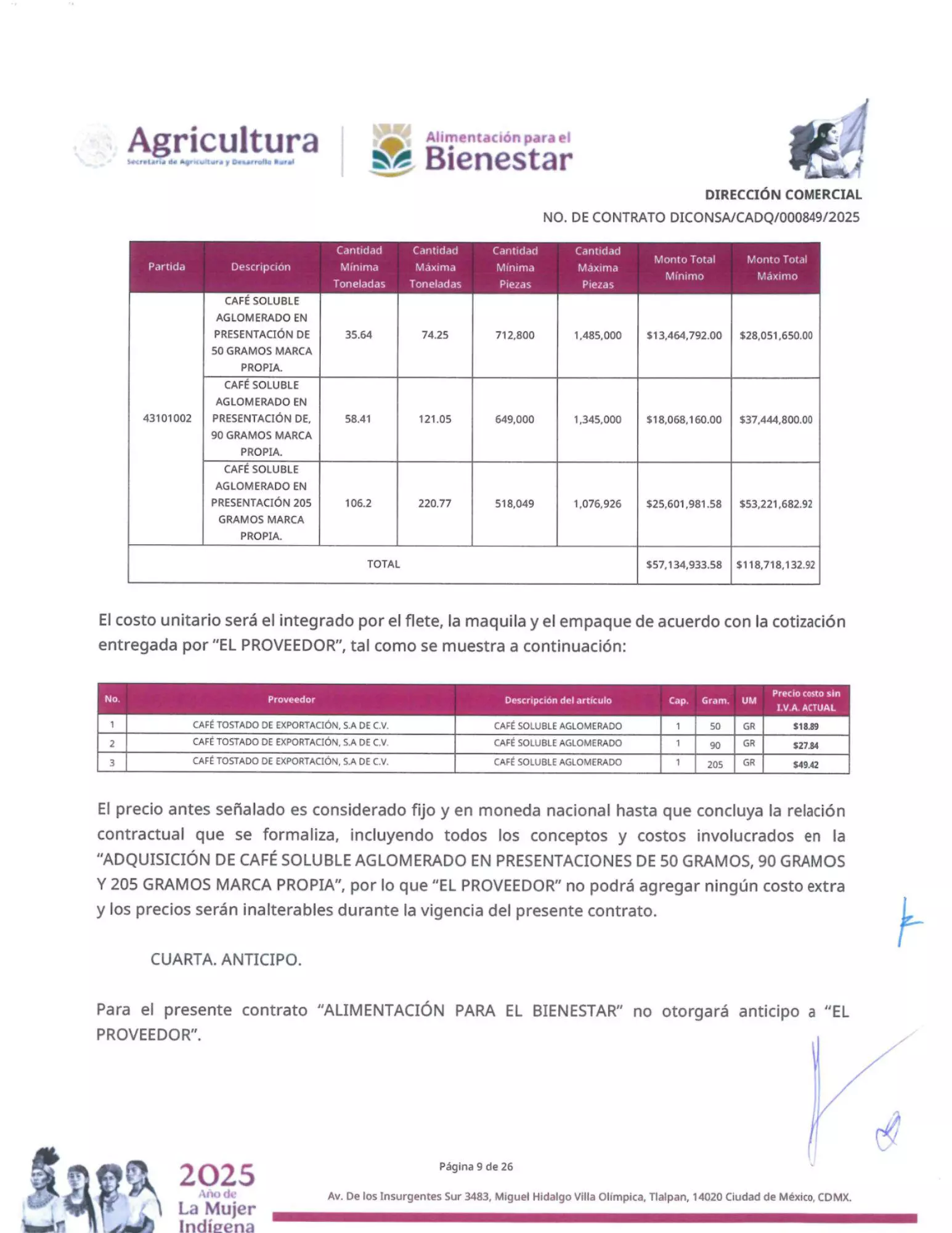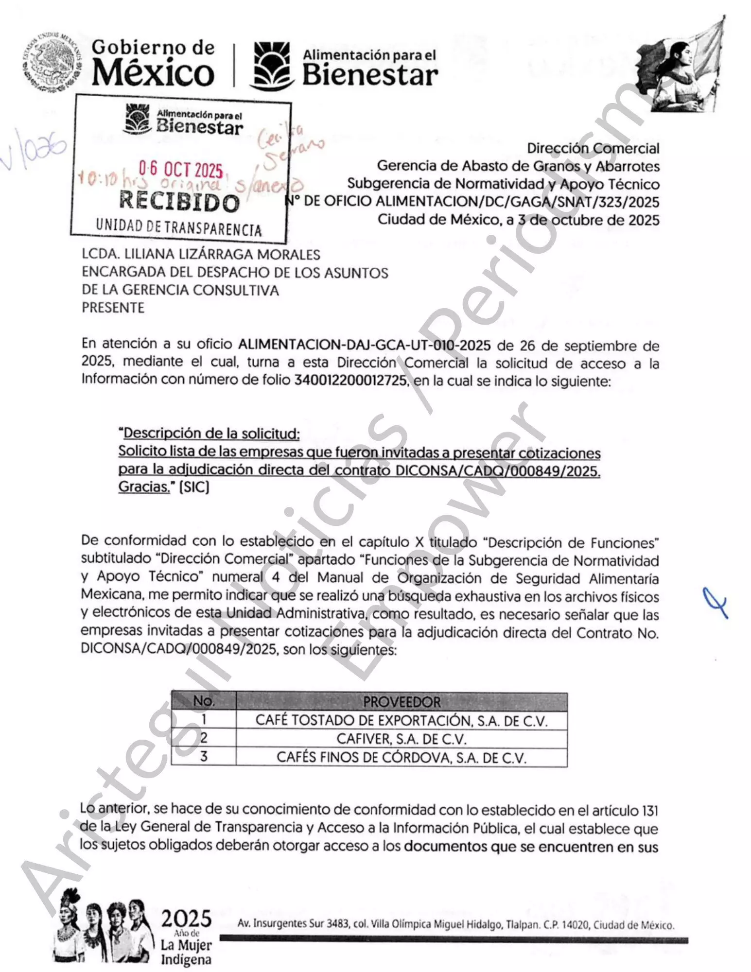 Tras realizar un análisis de precios, la dependencia otorgó a Catoex el contrato por adjudicación directa DICONSA/CADQ/000849/2025, en mayo de 2025, por una cantidad mínima de $57,134,933.58 M.N. y un monto máximo de $118,718,132.92 M.N. con vigencia hasta el 31 de diciembre de este año.