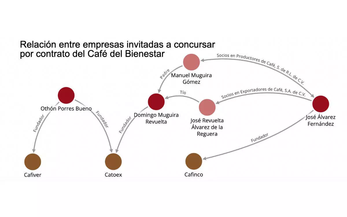 A su vez, José Álvarez Fernández, fundador de la tercera empresa invitada, Cafés Finos de Córdoba, fue socio del padre de Domingo Muguira Revuelta, fundador de Catoex. Lo cual muestra que las tres empresas invitadas a competir por el contrato para maquilar el Café del Bienestar, poseen relaciones entre sí.