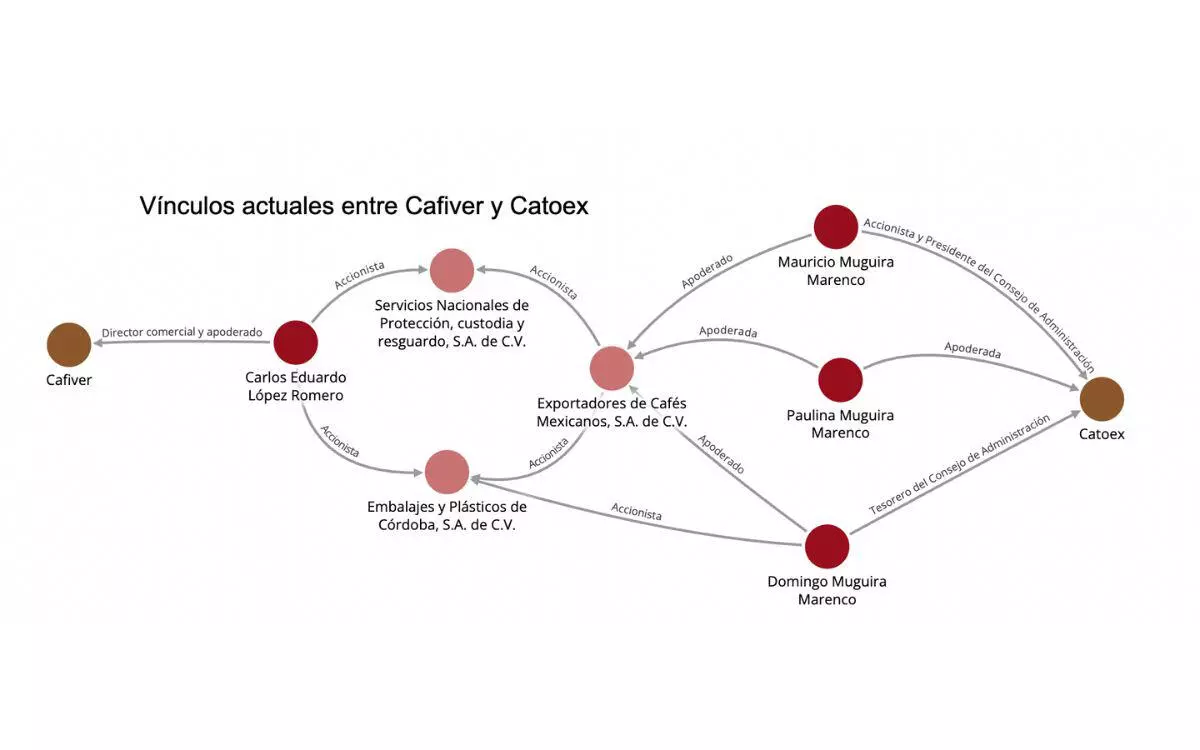 Por ejemplo, el actual director comercial de Cafiver, Carlos Eduardo López Romero constituyó dos empresas– Servicios Nacionales de Protección, Custodia y Resguardo, S.A. de C.V. y Embalajes y Plásticos de Córdoba, S.A. de C.V. – en sociedad con Exportadores de Cafés Mexicanos, S.A. de C.V., una empresa controlada por los Muguira Marenco, dueños de Catoex.