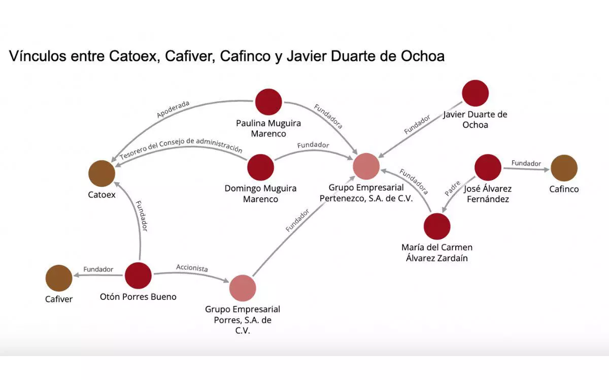 En Cafinco ocurre algo similar. La hija de su fundador, María del Carmen Álvarez Zardain, fundó Grupo Empresarial Pertenezco junto con Domingo y Paulina Muguira Marenco, Grupo Empresarial Porres— propiedad de Otón Porres Bueno— y el exgobernador veracruzano Javier Duarte de Ochoa, detenido en 2017 y sentenciado a prisión en 2018 por asociación delictuosa y operaciones con recursos de procedencia ilícita.