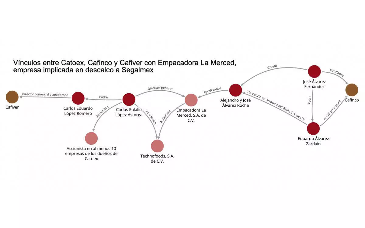 En este entramado, Eduardo Álvarez Zardaín, dueño de Cafinco, es tío y socio de José y Alejandro Álvarez Rocha. Ambos hermanos han sido apoderados de Empacadora La Merced, como se observa en el siguiente gráfico. A su vez, el director general de esta empresa, Carlos Eulalio López Astorga, fue apoderado de Catoex y socio de sus dueños en por lo menos otras 10 empresas. Este último es además padre del actual director de Cafiver, cerrando un círculo que conecta a las tres compañías a través de cargos directivos y lazos familiares.