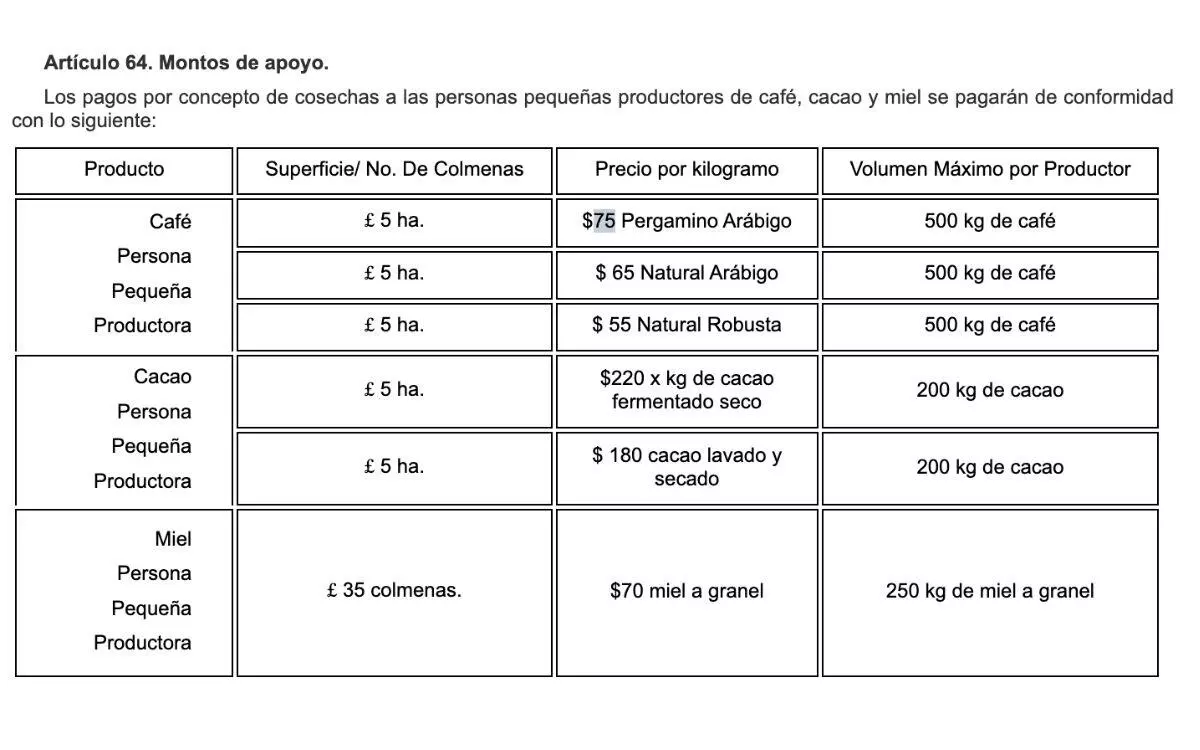 Para la compra de café, se determinó que los beneficiarios serían pequeños productores: aquellos con una producción no mayor a 5 hectáreas de tierra de cultivo, y que, a cada uno se les pagaría un precio de 75 pesos por kg de café pergamino arábigo, 65 pesos por kg de café natural arábigo, y 55 pesos por kg de natural robusta, hasta alcanzar un volumen máximo de 500 kg de café por cada productor.