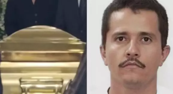 #Nacional ⚰️🚨 || El cuerpo que se presume corresponde a Rubén Oseguera Cervantes, “El Mencho”, fue trasladado en un féretro dorado desde una funeraria en la calle Gigantes hacia el panteón Jardín Recinto de la Paz en Zapopan, donde se realiza su sepultura.