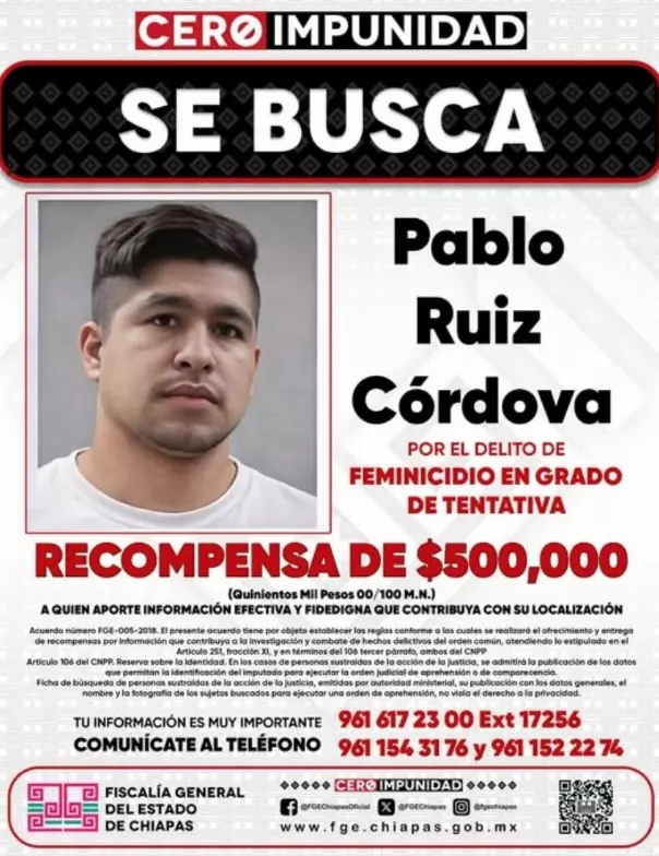 Como se dijo antes, actualmente Pablo Ruiz Córdova está prófugo de la justicia y se ofrece una recompensa de 500,000 pesos por información que lleve a dar con su ubicación y posterior detención, por lo que la Fiscalía General del Estado de Chiapas puso disposición la línea telefónica 961 617 23 00 Extensión 17256 y 961 154 31 76 y 961 152 22 74, así como a sus redes sociales oficiales para recibir información al respecto.