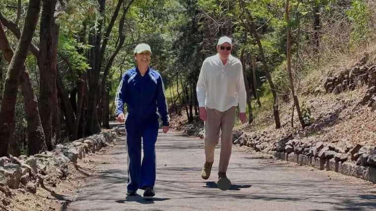 Sin embargo, en la imagen se ve a la presidenta vistiendo ropa deportiva y a su esposo con un pantalón cargo y botas cafés, caminando por una zona boscosa similar al Bosque de Chapultepec o el bosque de Tlalpan.
