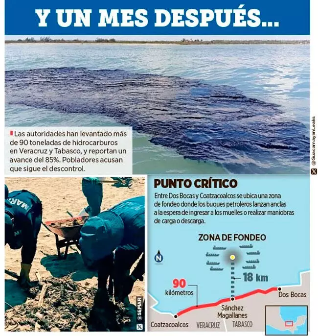 En paralelo a ese flujo marítimo, se ha registrado la presencia de hidrocarburo en costas de Tabasco y al menos ocho municipios de Veracruz, con riesgo de desplazarse hacia Tamaulipas, impulsadas por corrientes marinas del Golfo.