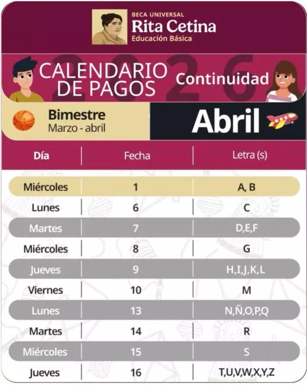 De acuerdo al Calendario de Pago, la entrega de la Beca Rita Cetina continuará hasta el jueves 16 de abril y el orden de las fechas ya se encuentra disponible a través de las páginas y redes sociales de la Coordinación Nacional de Becas para el Bienestar.