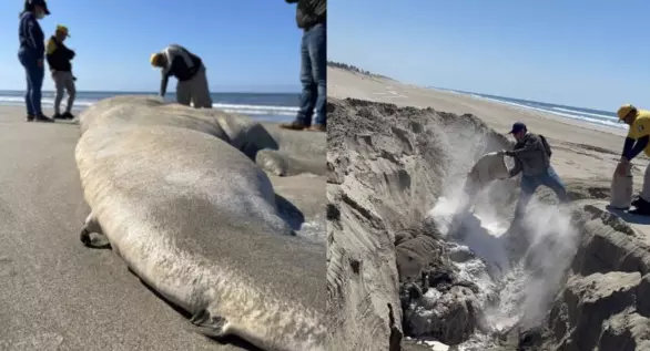 Maquinaria llegó al lugar para excavar la fosa donde ingresaron el cuerpo de la ballena el cual cubrieron de cal y arena para permitir su descomposición natural sin afectar el entorno ni el equilibrio del ecosistema.