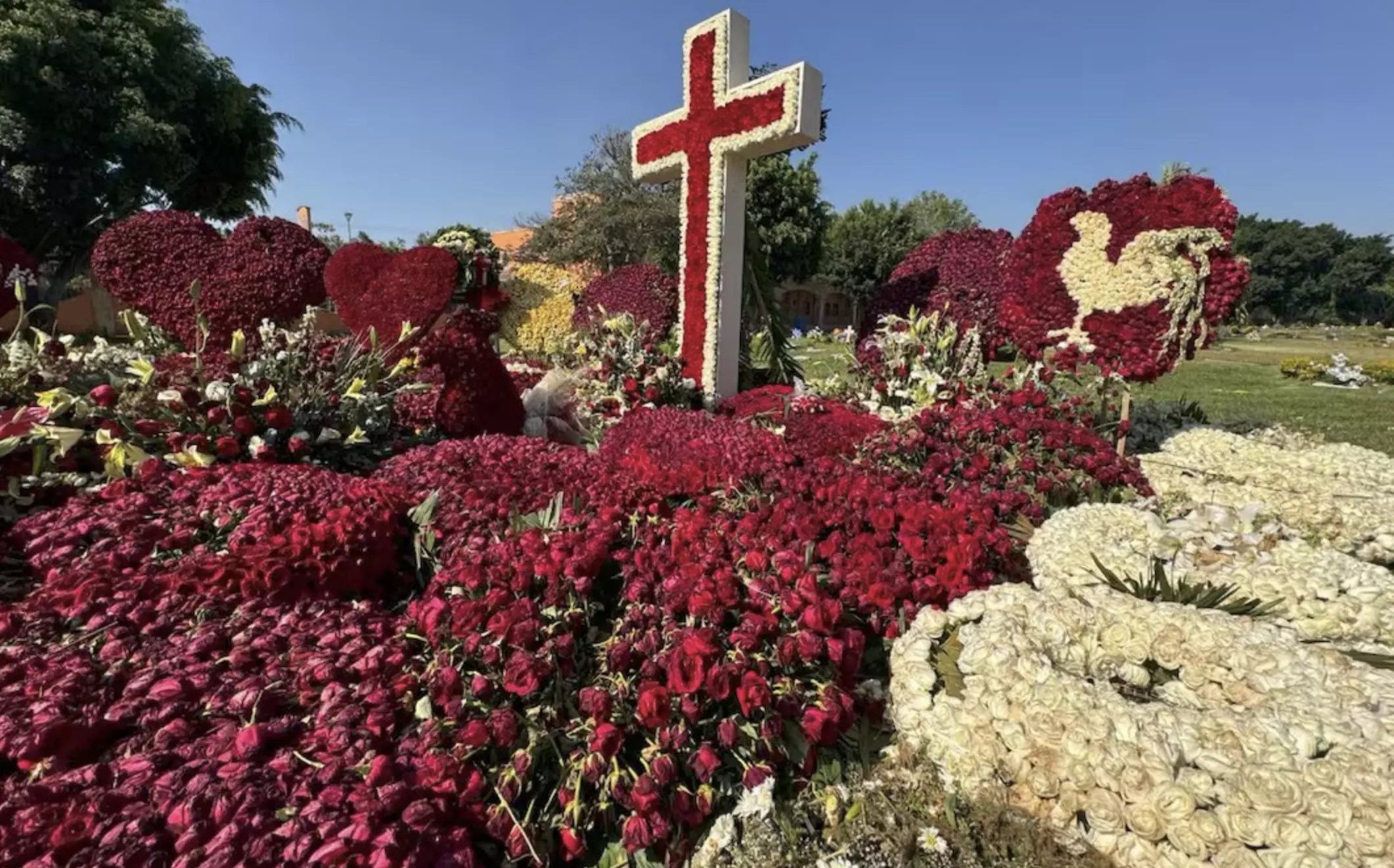 Zapopan, Jalisco.- Cinco días después de la sepultura de Nemesio Oseguera Cervantes alías El Mencho, la tumba del líder criminal permanece cubierta por más de una decena de coronas de luto y arreglos florales de rosas rojas y blancas.