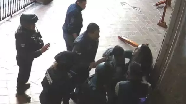Los siete elementos de seguridad y Oseguera rodean a la periodista, y entre jalones la acorralan junto a la pared, buscando despojarla de su celular; al fondo de la imagen se observan otros cinco uniformados que se acercan hacia ellos, con uno de los manifestantes detenido.