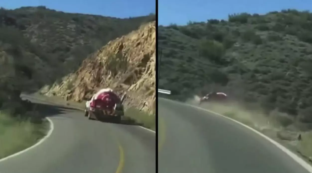 Un automovilista, que circulaba a unos metros detrás del vehículo de carga pesada, capturó el momento con su cámara de tablero, y difundió en plataformas digitales el momento en que pierde la víctima pierde el equilibrio y se desploma en un barranca a un costado de una acentuada curva.