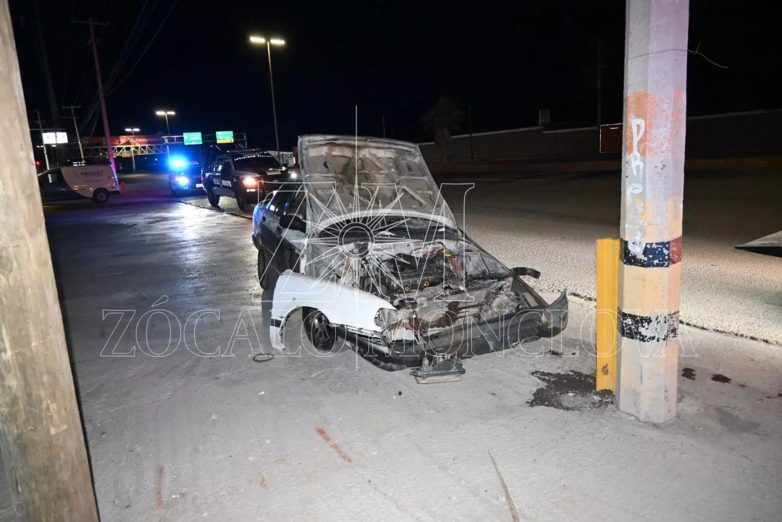 Monclova, Coahuila. - La madrugada de hoy, un vehículo Nissan Tsuru, en colores blanco con negro, terminó completamente inservible luego de estrellarse contra la base de un poste de concreto de la CFE sobre el bulevar Harold R. Pape, a la altura de la colonia Eva Sámano, entre las calles 3 y 5.