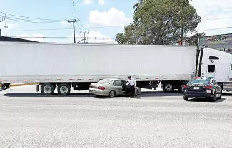 Monclova, Coah.- Una imprudente maniobra al intentar dar vuelta en “U” y el mal uso de la reversa provocó un percance vial entre un tráiler y un automóvil sobre una de las principales arterias de la ciudad.