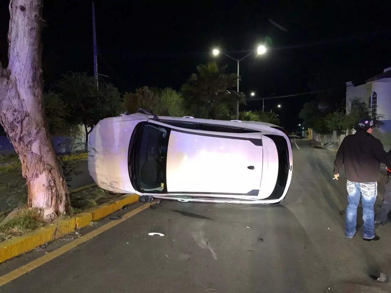 Esto provocó que se impactara contra una camioneta Jeep en color azul que se encontraba debidamente estacionada frente a un domicilio. Tras el fuerte choque, la unidad que conducía terminó volcándose y quedó recostada sobre su lado izquierdo, obstruyendo la vialidad.