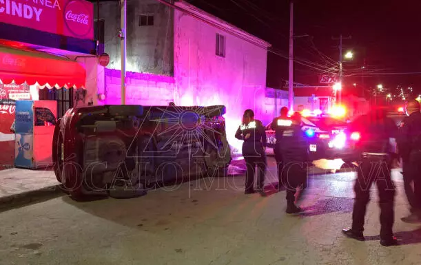 Tras el percance, el automóvil terminó volcado y recostado sobre su lado izquierdo, al filo de la banqueta de un conocido negocio de abarrotes. El dueño mencionó que la fachada de la tienda no presentaba daños; sin embargo, al escuchar el fuerte golpe, salió de su vivienda de inmediato.