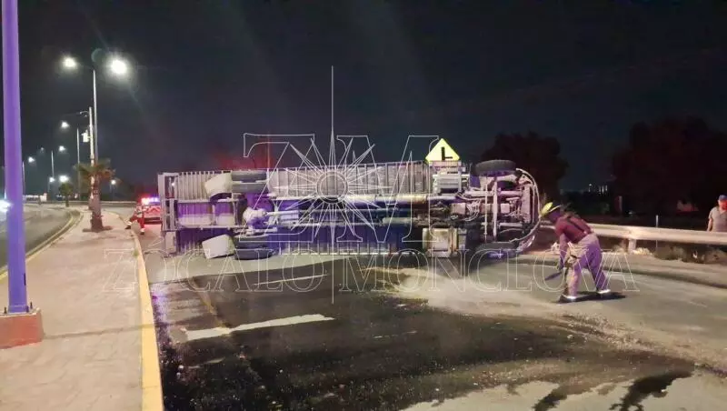 Fue alrededor de la 01:00 horas de la mañana cuando se reportó la volcadura de una unidad de carga de la marca Internacional, color blanco con caja azul, la cual quedó atravesada bloqueando los carriles de circulación de norte a sur, a pocos metros del entronque con el libramiento Carlos Salinas de Gortari, en la entrada de la ciudad.